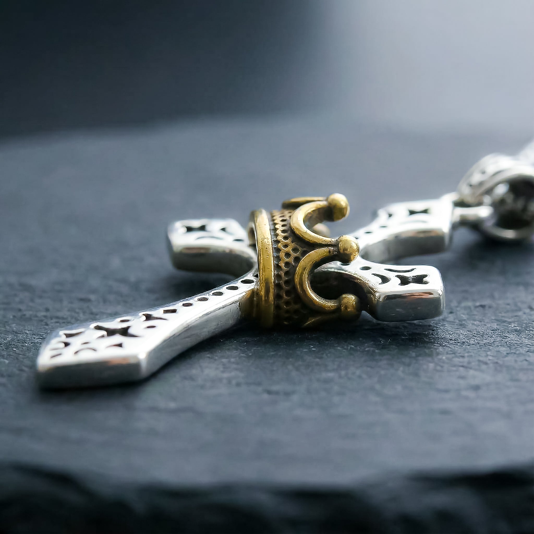 Un colgante con cruz y corona que simboliza fe, fortaleza y autoridad interior.