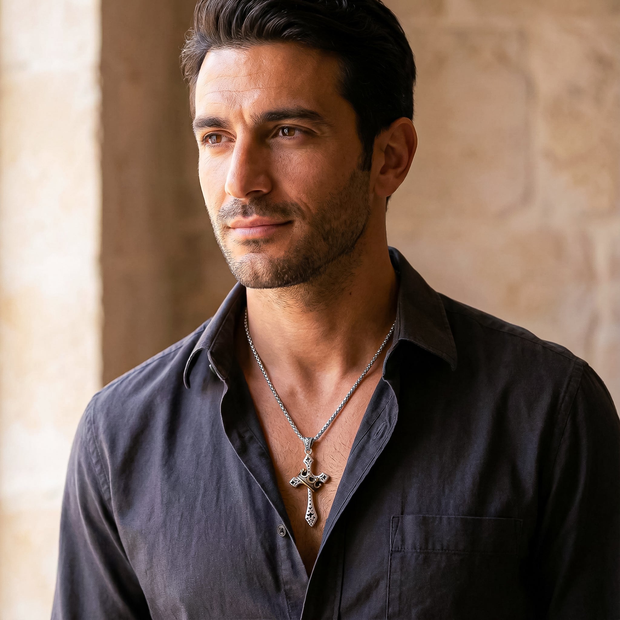 Esta cruz no está hecha para pasar desapercibida. Está pensada para quienes llevan la fe con carácter, para quienes entienden que un símbolo también puede ser una declaración personal. El diseño combina acero inoxidable con detalles en tono dorado, creando un contraste fuerte, elegante y masculino.