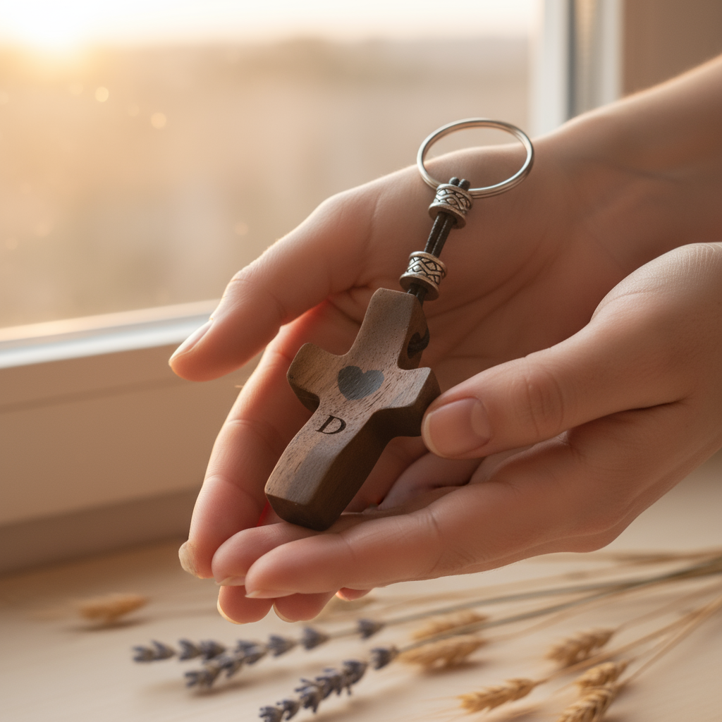 Llavero Cruz de Madera Grabada| Personalízalo con Nombre e Inicial | Regalo Hecho a Mano