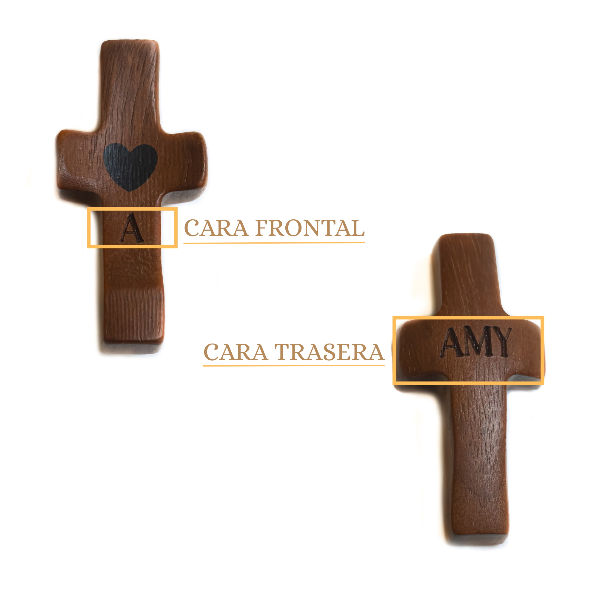 Cada cruz se convierte en una pieza única gracias a su grabado láser personalizado, incluido sin coste adicional. Puedes añadir tu
