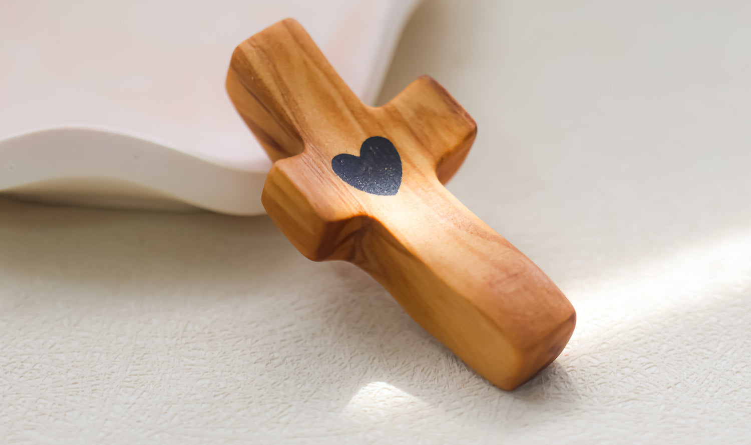 Su forma ergonómica invita a sujetarla, acariciarla, respirar. Está hecha de madera natural de olivo y grabada con un pequeño corazón en el centro: un recordatorio de fe, de amor y de presencia.