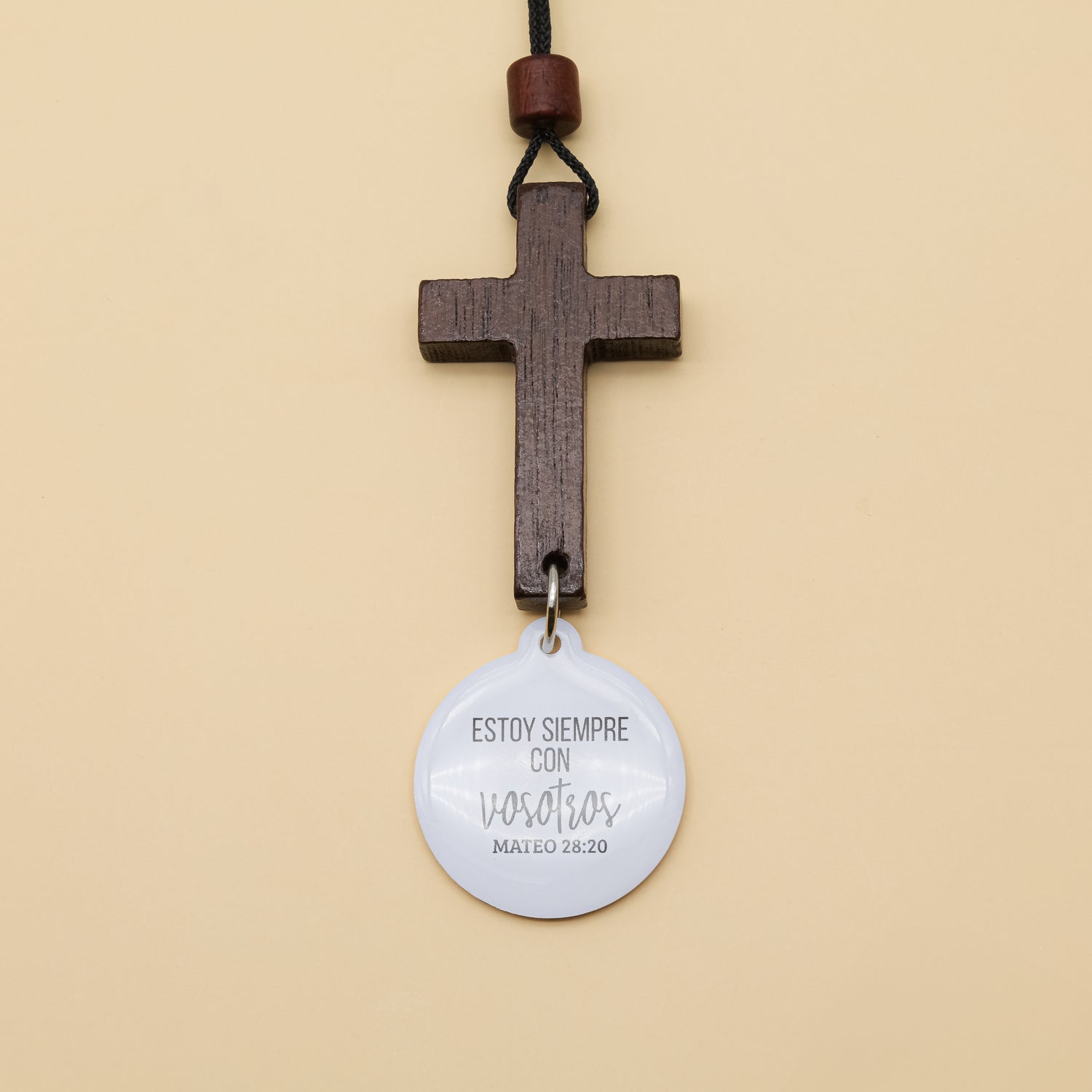 Cruz principal: Madera natural tratada, con acabado liso y resistente a la humedad ligera y al uso diario.