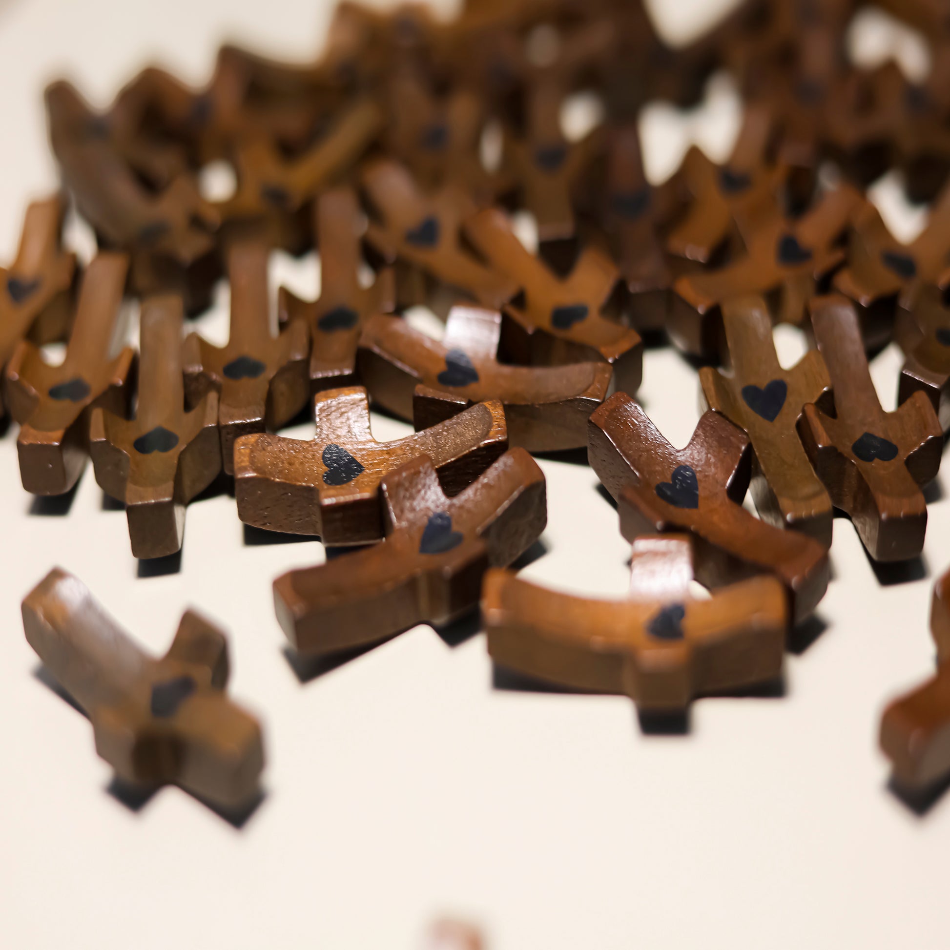 Su forma ergonómica invita a sujetarla, acariciarla, respirar. Está hecha de madera natural y grabada con un pequeño corazón en el centro: un recordatorio de fe, de amor y de presencia.